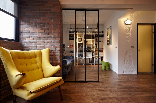 用黑色铁框玻璃移门做隔断,在不阻碍光线穿透的同时起到分割区域的作用,利落的线条与砖墙带出丰富的纹理。